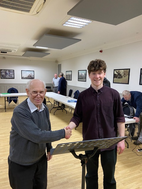 Allan (Lutterworth SC) receives the Topics trophy from Sarah (Regional Co-ordinator).